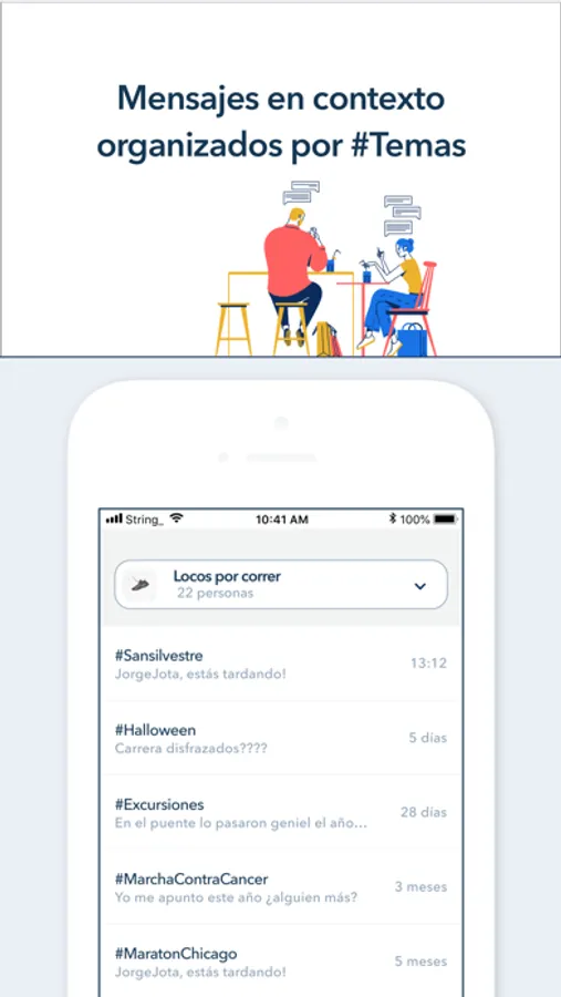 • UTILIZA #TEMAS: Conversa con todos los miembros del grupo como haces habitualmente. Pero si hay un tema que va a suponer mucha participación, identifícalo como #TEMA y a partir de ahí los comentarios pertenecientes a ese tema aparecerán identificados y podrás discutir dentro de ese tema. De manera que tus conversaciones estén ordenadas y en contexto y no te pierdas entre muchas conversaciones.