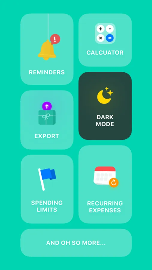 100% free • Budgets • Reports • Tags • Categories • Wallets/Accounts • Bills • Widgets • Import/Export • Calculator • Search • Currency • Tag organizer •••