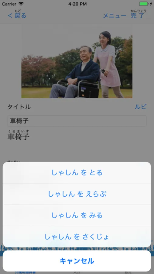 ・補足コンテンツ作成機能:介護用語の理解を深めるために補足するコンテンツ(文例、写真、動画)の作成。
