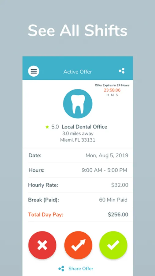 Set your desired work area, and then get notified when shifts are posted in your area. Make a counteroffer (now available for rate & time) or accept shifts that work for you. Show up, do what you do best, rate and review the office, and then get paid via direct deposit in 2-3 business days.