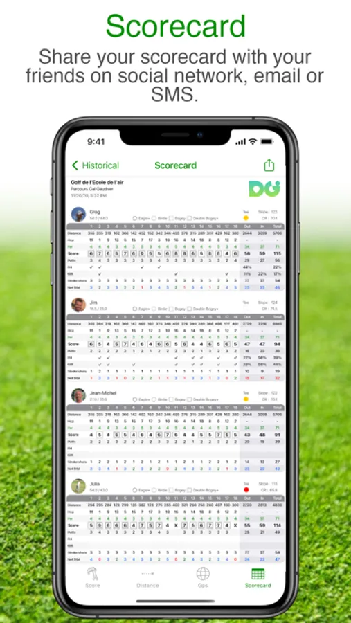 The scorecard is multiplayer (1 to 4 players) and it is possible to share it on social networks or send it directly to your friends by email or SMS.
