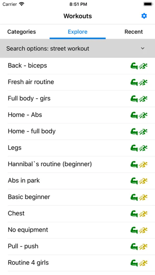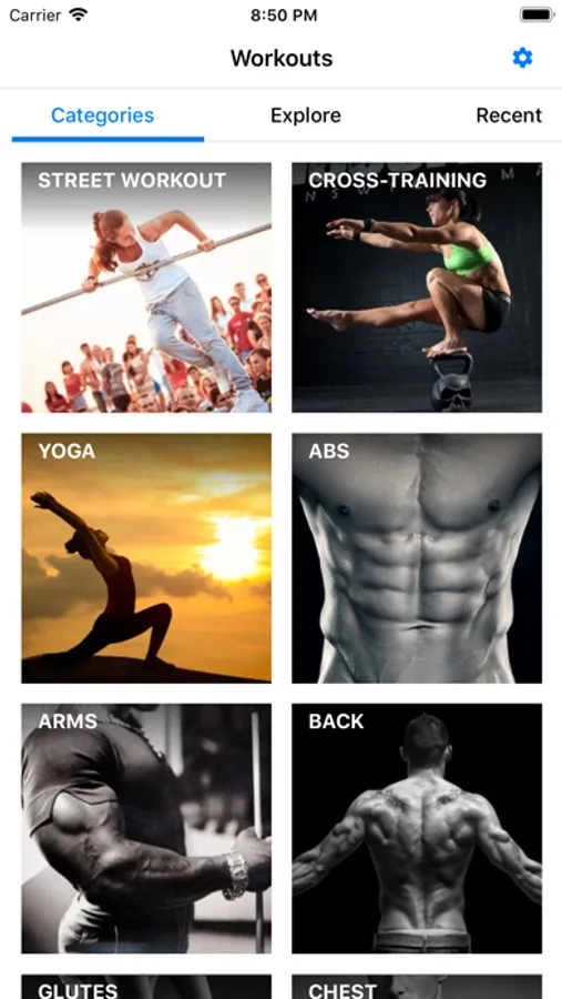 On the main screen you will see categories for finding workouts: Street Workout, Cross-training (functional training, WOD's), Yoga, abs, hands, back, buttocks, chest, legs, shoulders, without equipment, beginner, cardio. For a more detailed search, you can use filters. Why so many filters? Be cause we have a very large number of workouts.