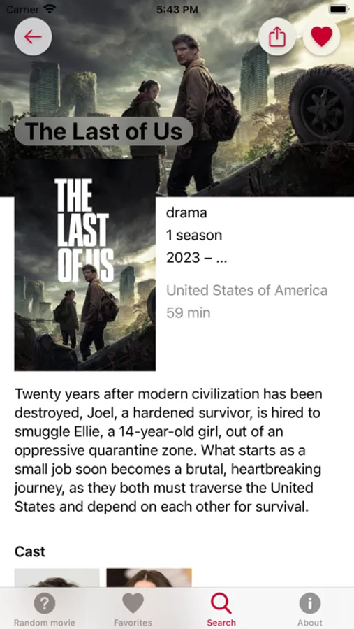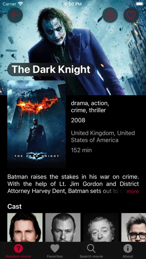 Also the received film information has description, which tells more about cast and crew of the randomly selected film. It remains only to press the desired button!