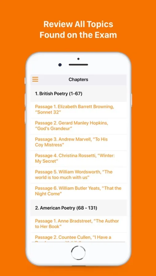 This free application includes all questions in Chapter 1 - British Poetry (1-67). The remaining 433 questions are available through an in-app purchase of $15.99.