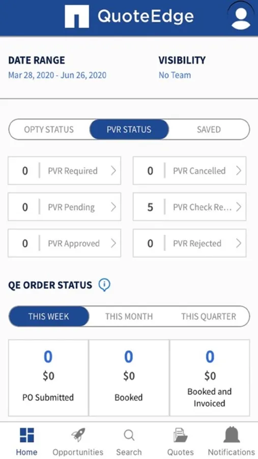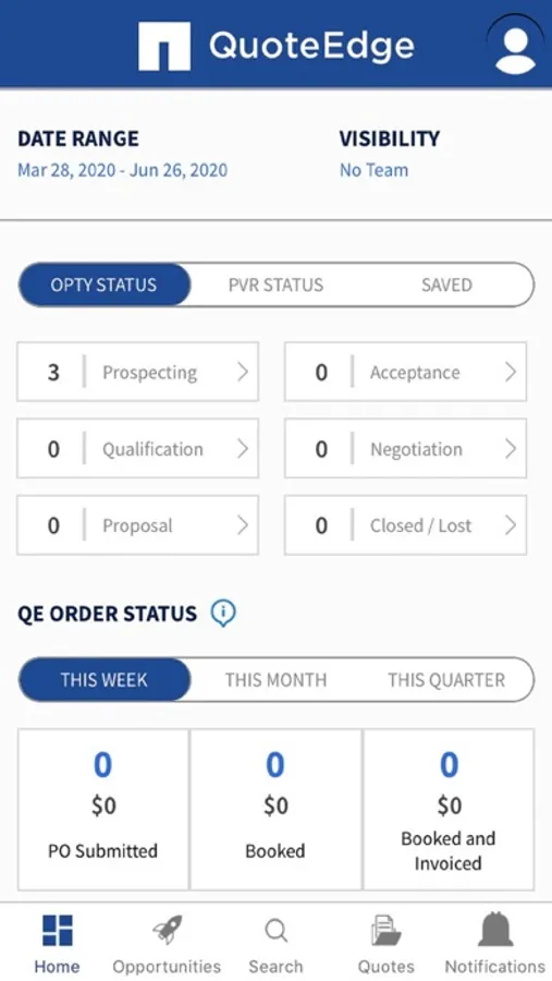 - A personalized home screen includes a dashboard view of the quote and order lifecycle