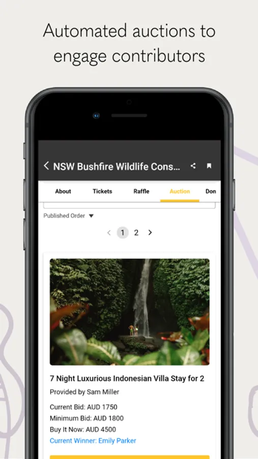 'Auctions' allow organisers to put items up for bidding. Organisers can customise the name and description of an item, add images, and set the starting bid, bid increment, reserve amount, and Buy It Now amount. Auctions ran on the application happen in real-time. To participate, contributors need only enter a maximum bid amount and the application bids for them. When they are outbid, the application bids again until their maximum bid is reached.