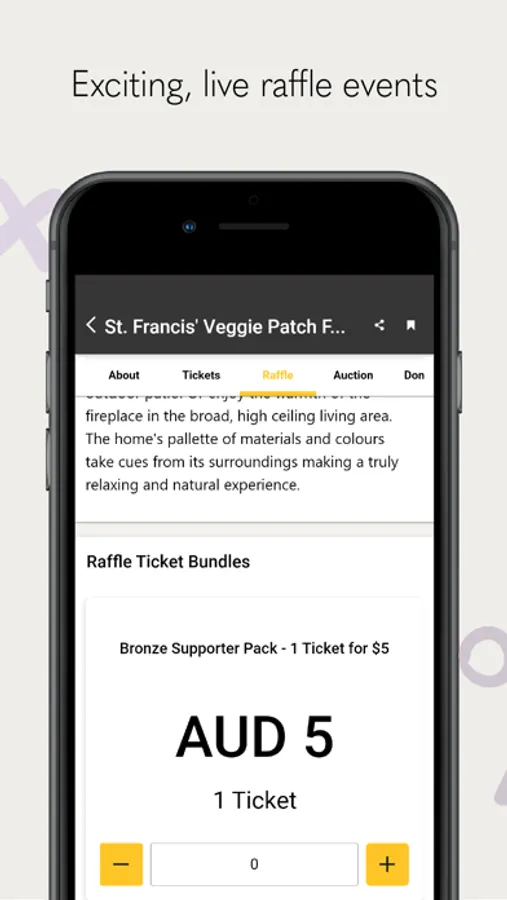 'Raffles' allow organisers to sell raffle ticket bundles and giveaway prizes. Organisers can customise the name, price, and number of tickets of raffle ticket bundles. Raffles drawn on the application are automatable. Organisers need only enter the raffle draw time, and the application will randomly draw a winning ticket for every prize set. The owner of the winning ticket receives a notification of the prize they have won.