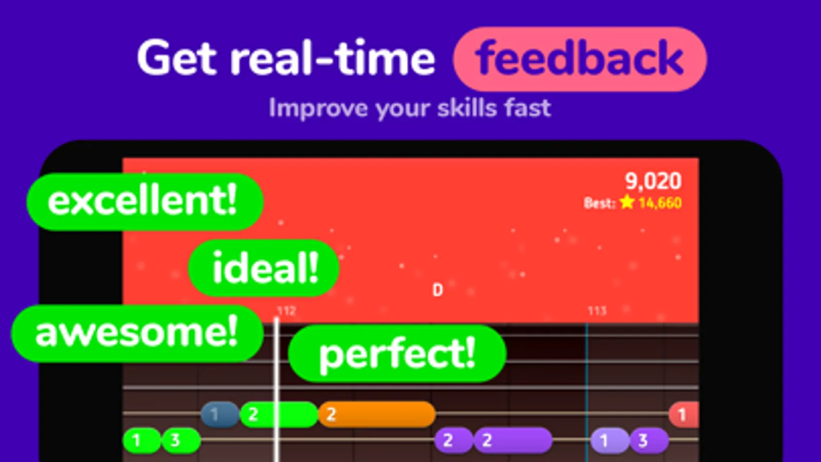 Improve your skills by playing popular songs. The app will hear you play and give you feedback so you can get results faster and start playing songs you love.