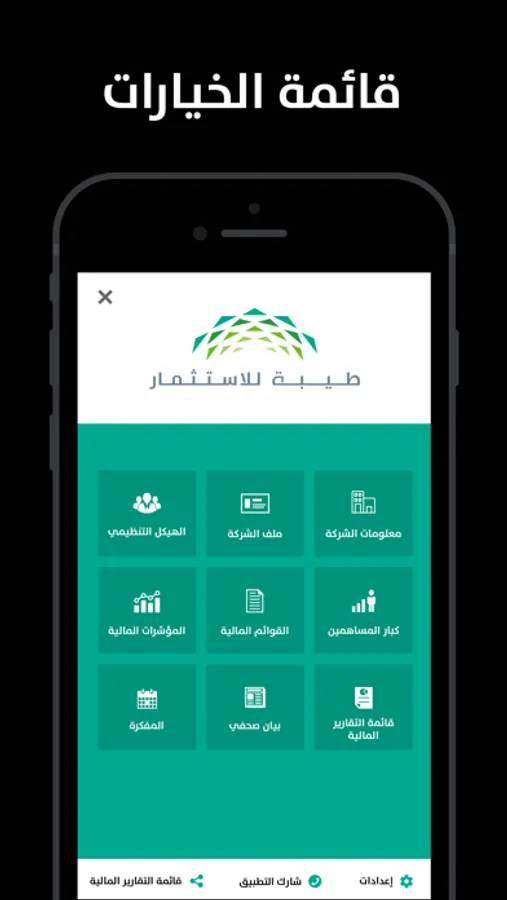 يحتوي تطبيق طيبة القابيضة لعلاقات المستثمرين على: