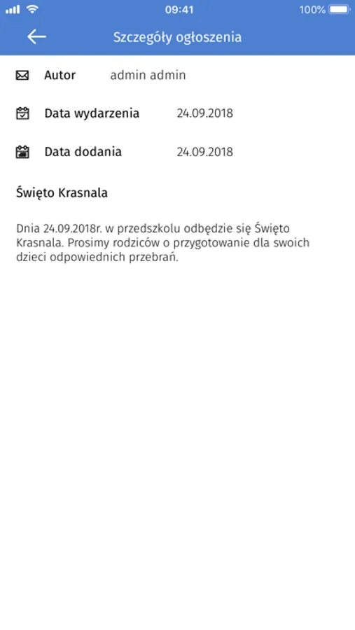 Bieżące informacje o wydarzeniach w przedszkolu, wymaganych strojach dla dzieci lub rzeczach, które należy przynieść dla dziecka.