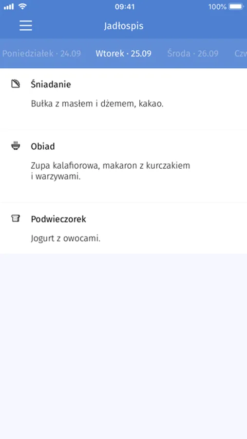 Możliwość sprawdzenia jadłospisu z danego dnia oraz tygodnia. Lepsza kontrola nad spożywanymi przez dziecko codziennymi posiłkami.