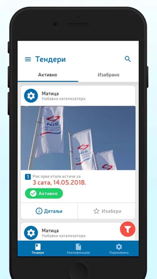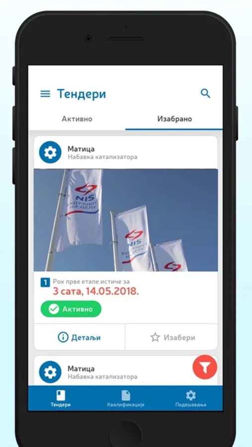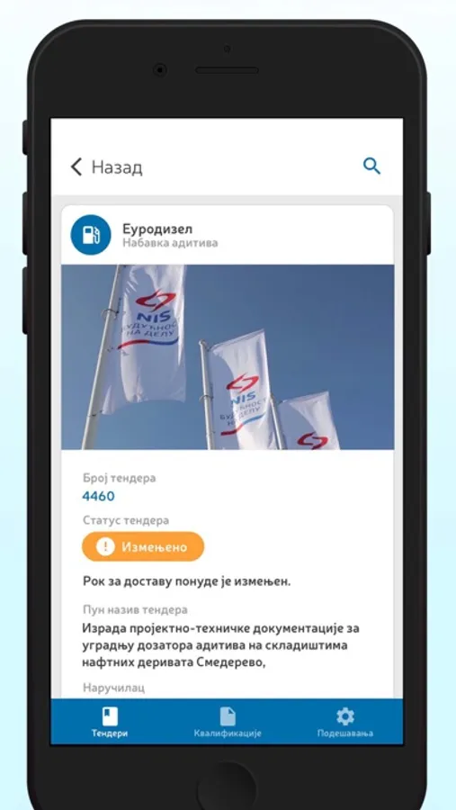Preko NIS mTenderi aplikacije, možete pratiti odabrane tendere, aukcije i kvalifikacije. Cilj ove aplikacije jeste da omogući svakom pojedincu da preko podešavanja postavi filtere u skladu sa sopstvenim preferencama, te da mu u skladu sa podešavanjima stižu notifikacije.
