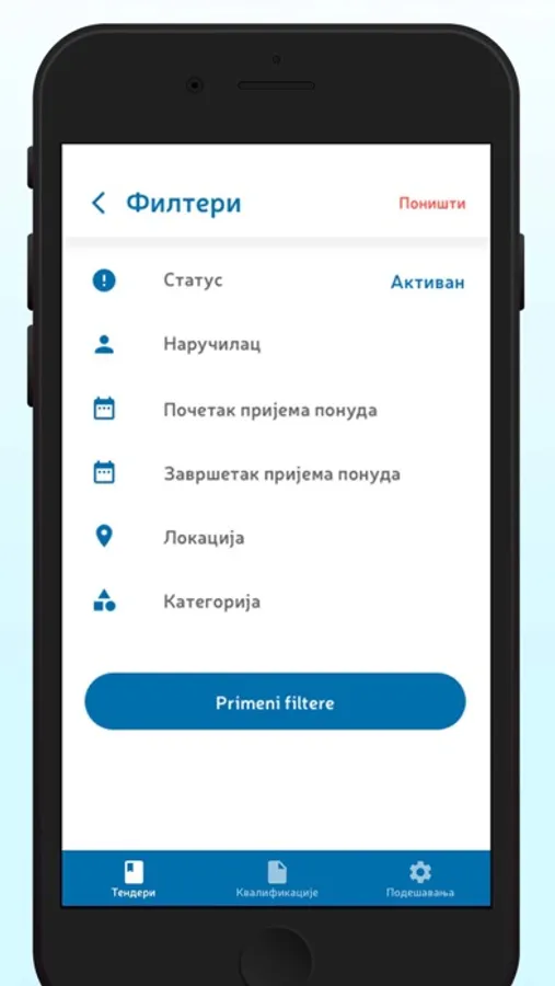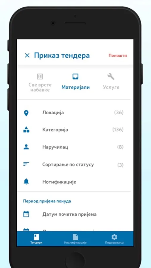 Sve tendere/aukcije/kvalifikacije možete pretraživati po imenu ili broju. Takođe, možete ih filtrirati i sortirati prema lokaciji, kategoriji, imenu, broju, naručiocu, statusu, datumu početka ili završetka prijema ponuda.