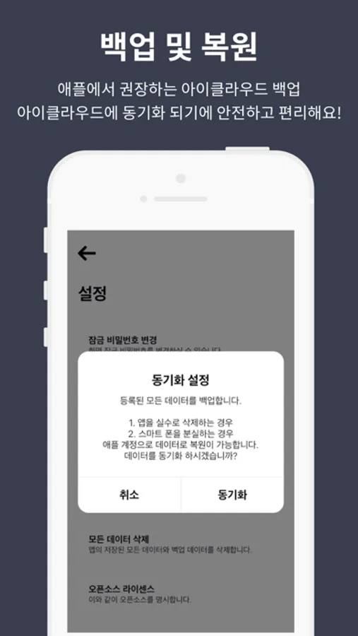 - 아이클라우드 자동 동기화 (백업 및 복원)