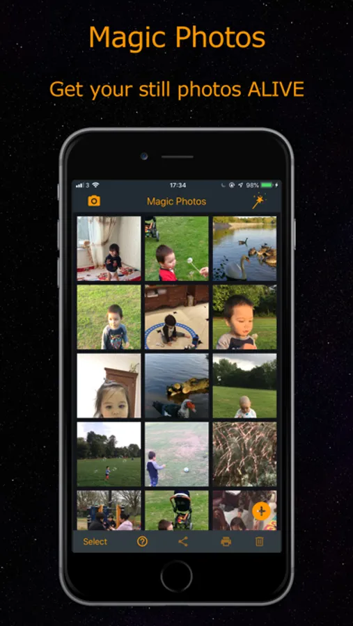 Magic Photos plays an Augmented Reality (AR) video linked to any photo you print at home. View your printed photo through the app, and watch it come to life as a "moving picture" within its frame, just like at your favorite School of Witchcraft and Wizardry!