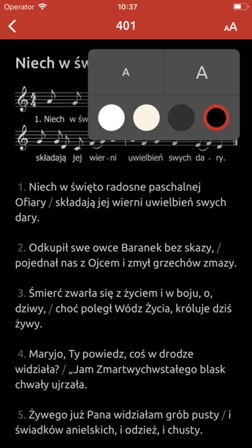 W aplikacji dostępne jest wyszukiwanie pełnotekstowe, zmiana rodzaju czcionki (szeryfowe/nieszeryfowe) pisma, automatyczne wyłączanie dźwięków, tryb nocny, możliwość ograniczenia automatycznego usypiania ekranu, zapis utworu lub modlitwy w zakładkach lub w sekcji "ulubione", a także zmiana wielkości wyświetlanego tekstu.