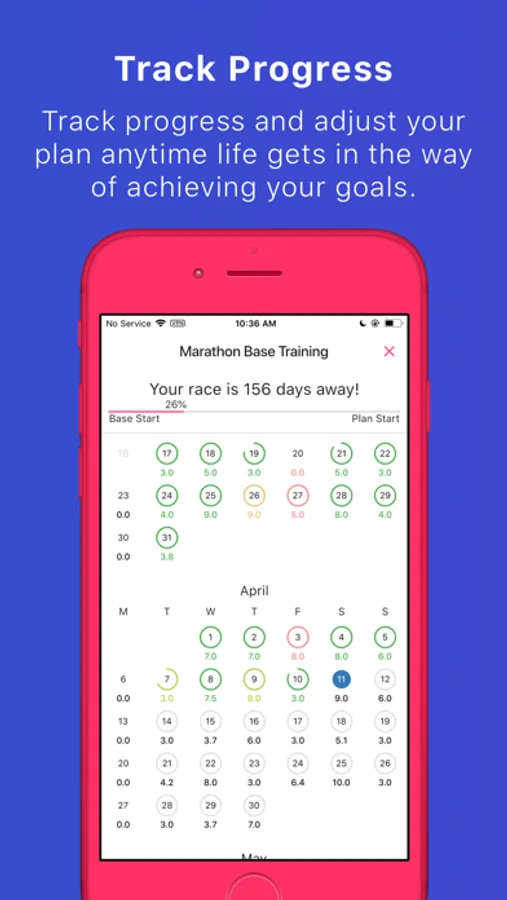 - Keep track of your training plan stats. Average pace, total distance, and more.