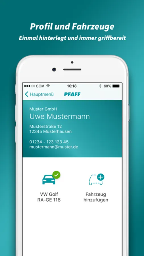 Der PFAFF Unfall-Helfer navigiert Sie auf Wunsch automatisch zu PFAFF, Ihrer zertifizierten m.o.r.e Werkstatt. Kontaktieren Sie uns auch gerne über die anderen Kontaktmöglichkeiten in der App.