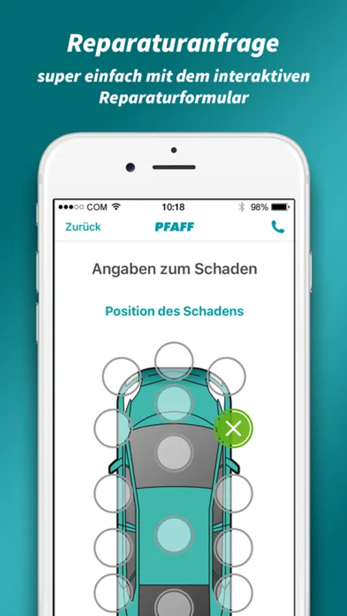 Einfach im PFAFF Unfall-Helfer unter „Reparaturanfrage“ die betroffenen Stellen am Fahrzeug markieren. Fügen Sie auch gerne Fotos hinzu. Senden Sie uns Ihre Anfrage und wir melden uns bei Ihnen mit einem individuellen Angebot.