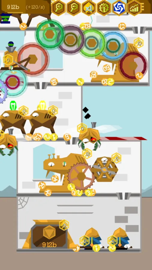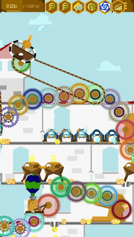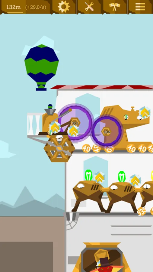 There are engines, which will work while you are away. Coal mines dig for fuel for your engines. Balloons travel far away and bring money back. Coin stompers and real magnifying glasses increase the value of coins passing by. Teleporters for coins help you organize cash flows and money cycles. Portals generate narrativium to give you boosts when you restart the game (prestige) and let you travel to other steampunk/dieselpunk/gaslamp fantasy worlds.