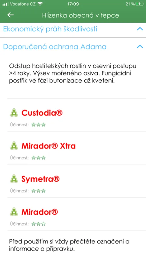 Aplikace také obsahuje doporučení, kterými přípravky z nabídky Adama CZ je možné vybraný problém vyřešit i s ohodnocením jejich účinnosti.