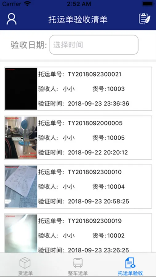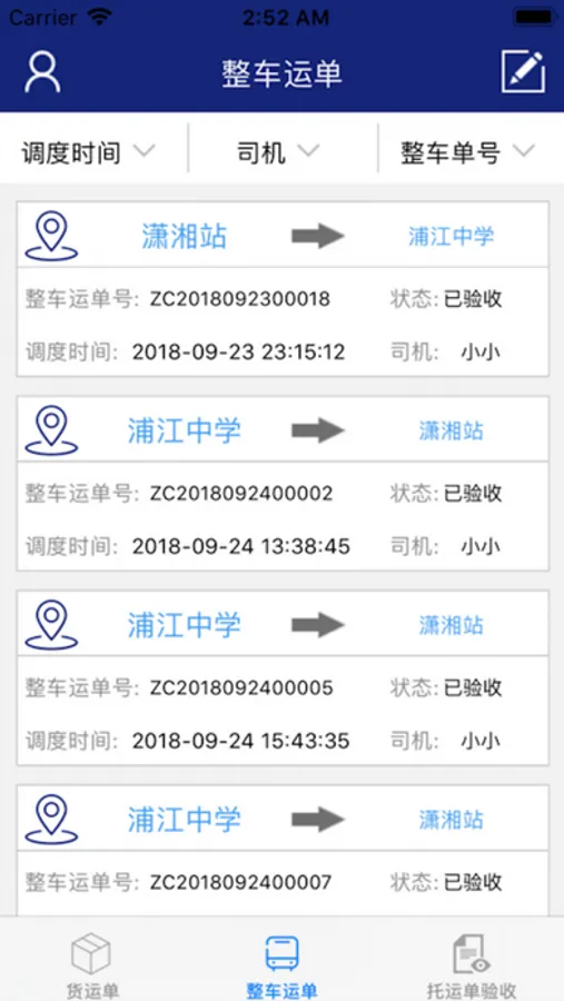 本软件分为3个模块:托运单列表,整车运单列表,整车运单验收列表
