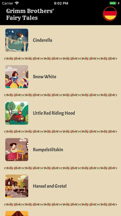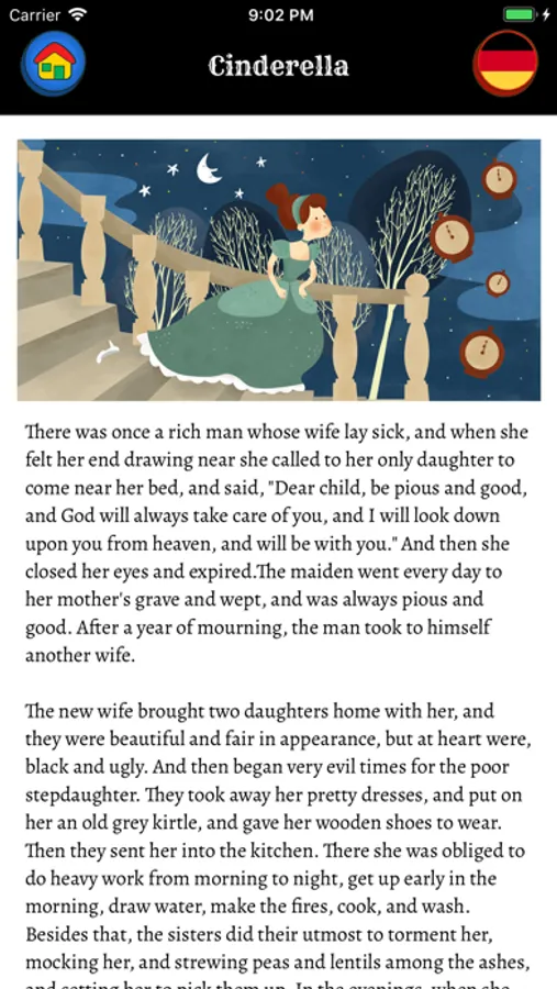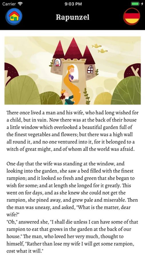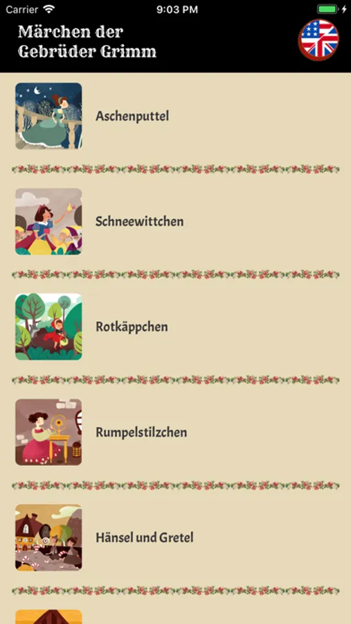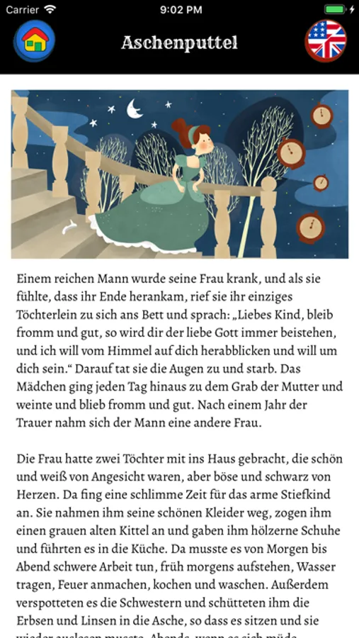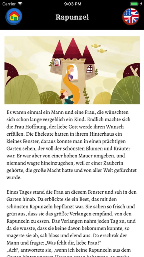 Originally written down in the 19th century, the stories have been adapted to modern language for easier reading. Switch to German and back by tapping the button in the top right to see the stories written in both languages. The app will remember your preferred language.