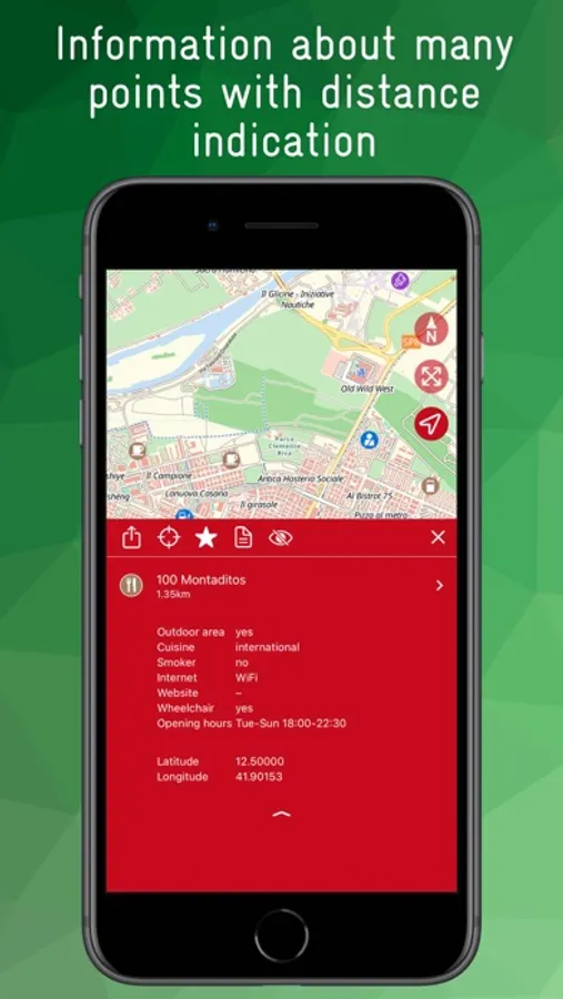 For many POIs there is further information such as opening hours, address, disabled access, ... Notes or favourites can be created for each POI, a history list shows the most recently used POIs, content can be shared.