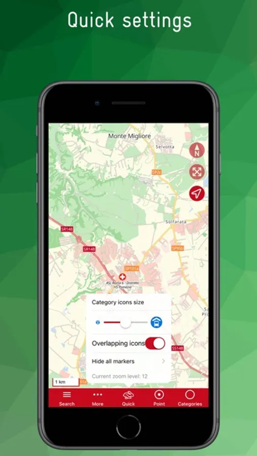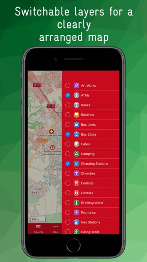 POIs are grouped into categories and can be displayed as layers. For example, you can display all restaurants, public transport lines, banks, hiking trails, charging stations and doctors on the map. The size and overlap of the icons can be adjusted to improve clarity.