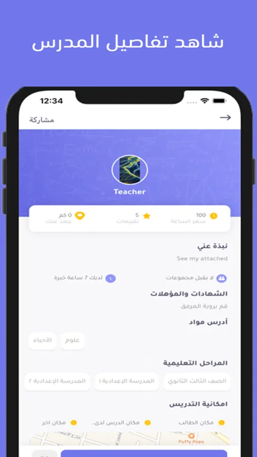 يستفيد الطالب من استعراض المدرسين المؤهلين والمتخصيين ضمن نطاق مكاني قريب منه. كما يمكن للطالب الحجز الفوري للحصص بخطوات سريعة ويسيرة.