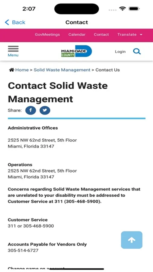 Email and telephone contact information for the Miami-Dade Department of Solid Waste Management.