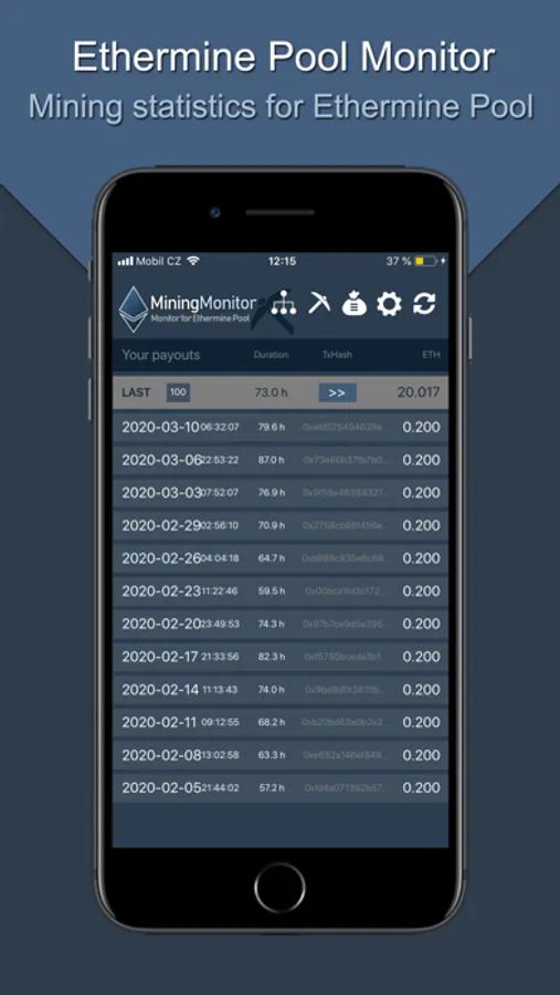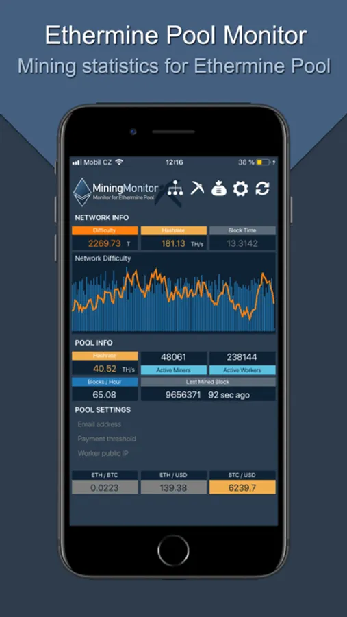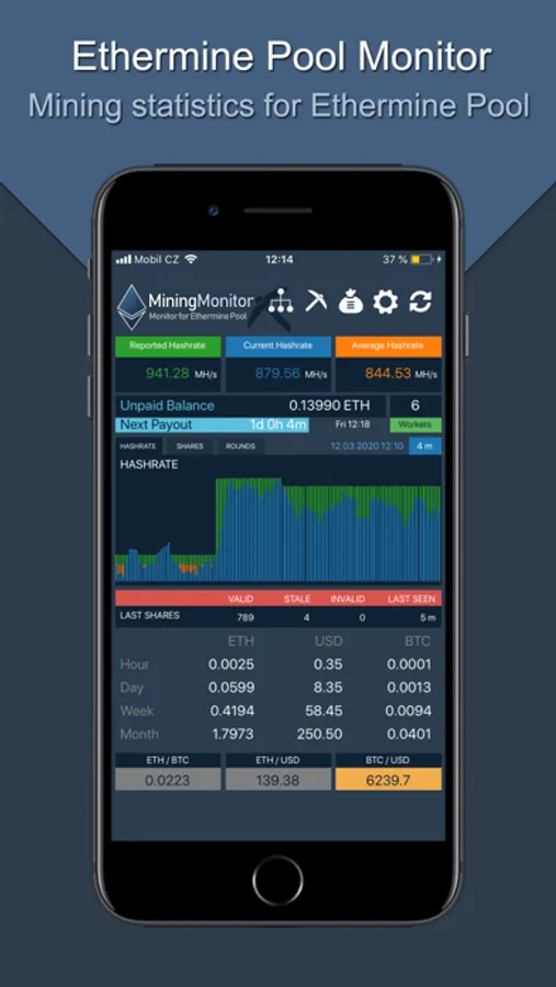Monitor for Ethermine Pool is simple application for checking your miners on Ethermine pool (Ethermine org). Check your current Hashrate, Balance, Workers, Next payouts, Chart and many other information. Check your Ethereum mining rigs from your iPhone or iPad!