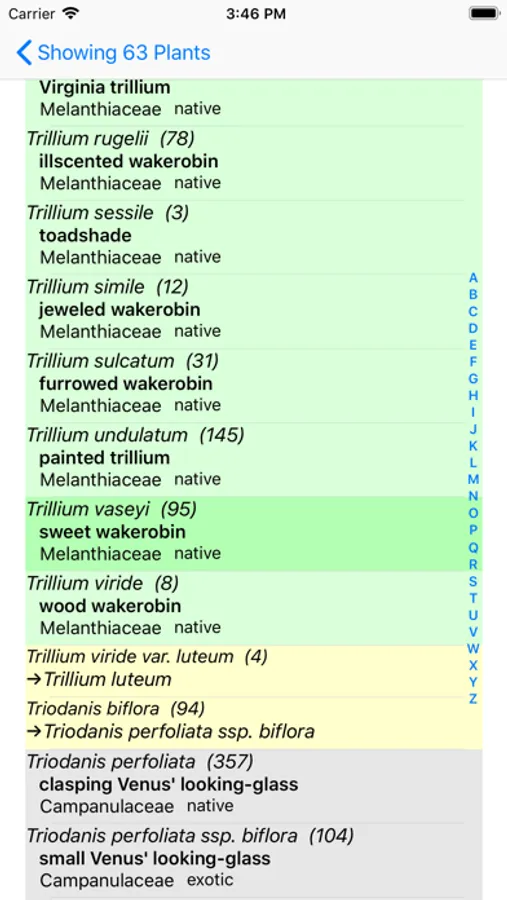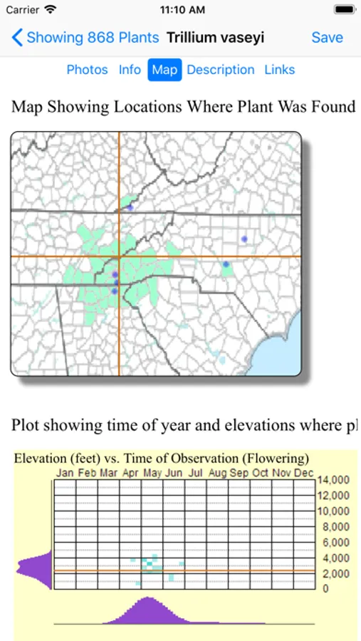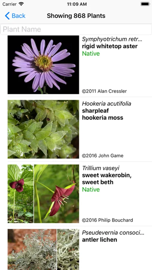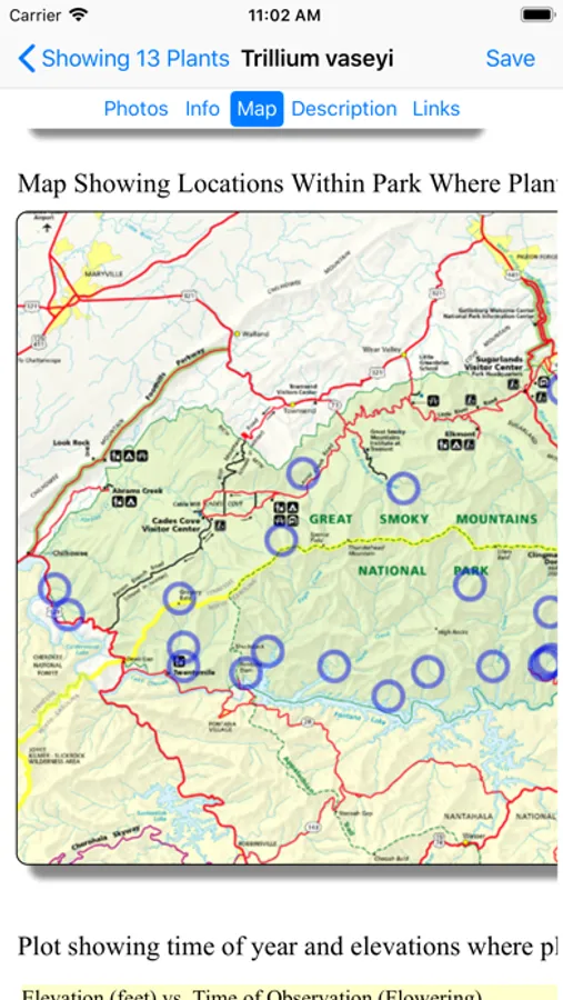 The App includes 2,715 species of plants found in the Great Smoky Mountains. Overall, 1,120 are "Wildflowers", 210 are shrubs, 172 are broadleaf trees, 25 are conifers, 59 are vines, 350 are grass-like, 81 are fern-like, 300 are moss-like, and 297 are lichen.