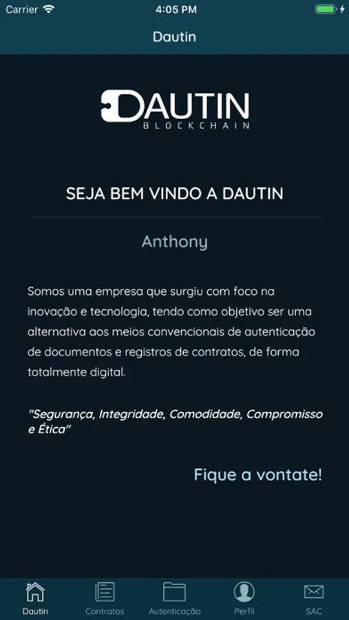 A Dautin é uma empresa que fornece serviços inovadores, tais como: gerar provas de autenticidade de qualquer documento, criar registros de contratos com múltiplos signatários, fornece uma identidade na rede blockchain Ethereum, armazenar seus documentos e compartilhar com outros usuários, vincular e administrar um cadastro de Pessoa Jurídica e muito mais!