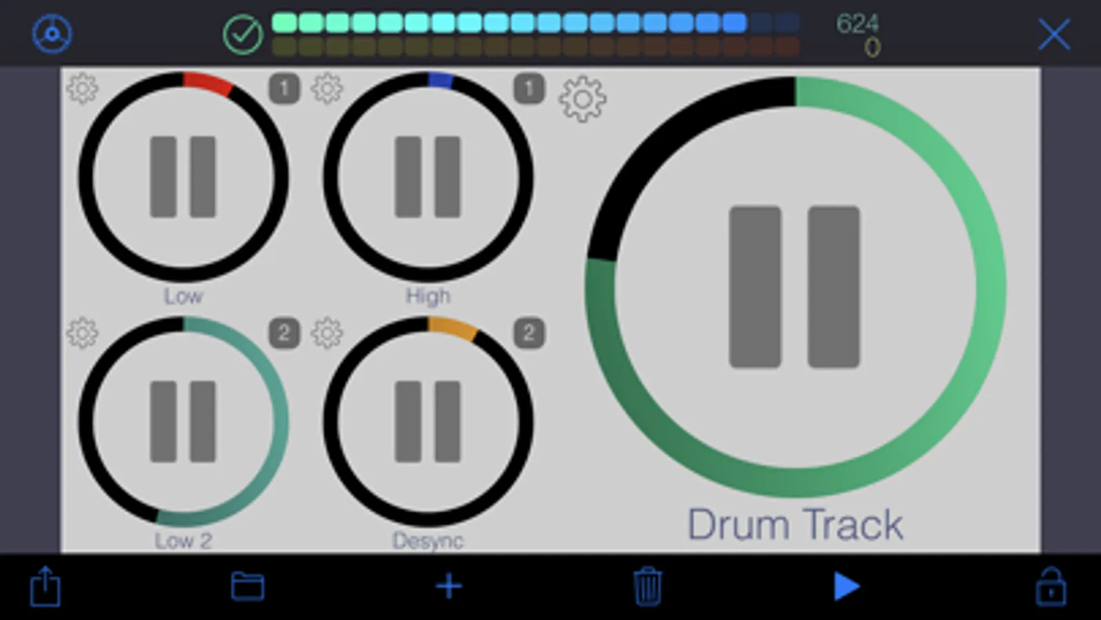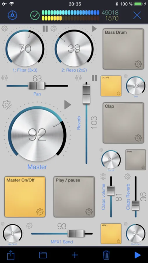 Pads are special controls: they can either produce CC Events or Notes. If bound to a CC, the pad acts as an on/off switch (you specify the values for each state.) If bound to a note, each tap produces the specified MIDI note. This is particularly useful to operate MIDI instruments without keyboards such as synthesizer modules or drum machines.