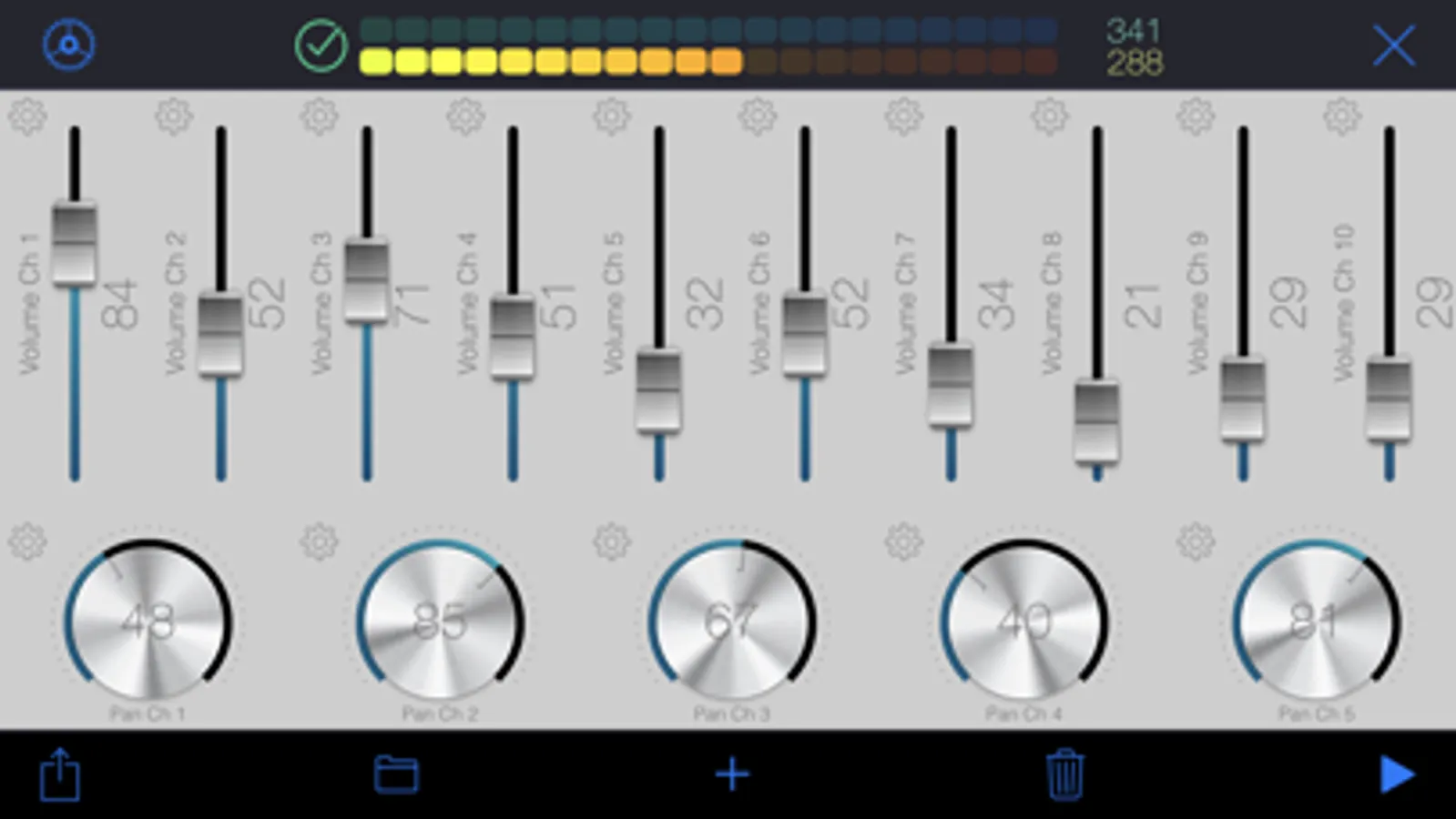 A control is bound to a MIDI channel and a specific Control Change number. You can either specify the CC number if you know it, or let the app learn it. Once placed on the surface, use this control to interact with your MIDI device. Alternatively, any CC event sent by your device will be shown live by the control(s) bound to this CC.