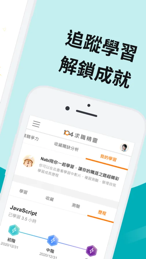104求職精靈 期許藉由 104 大數據幫助年輕人導引出職涯下一步並提供個人化潛力職務競爭力分析;實際告訴你企業所需的技能並透過免費有架構的測驗/學習影片以精準學習加強競爭力!
