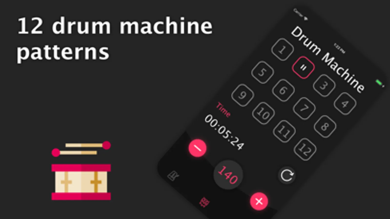 - A drum machine with 12 great patterns ranging from 70 to 160 beats per minute (BPM).