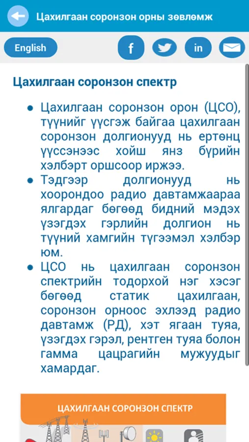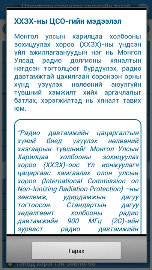 Монгол улсын харилцаа холбооны зохицуулах хороо (ХХЗХ)-ны үндсэн үйл ажиллагаануудын нэг нь Монгол Улсад радио долгионы хяналтын нэгдсэн тогтолцоог бүрдүүлэх, радио давтамжтай цахилгаан соронзон орны хүнд үзүүлэх нөлөөний аюулгүйн түвшний хэмжилт хийх аргачлалыг батлах, хэрэгжилтэд нь хяналт тавих юм