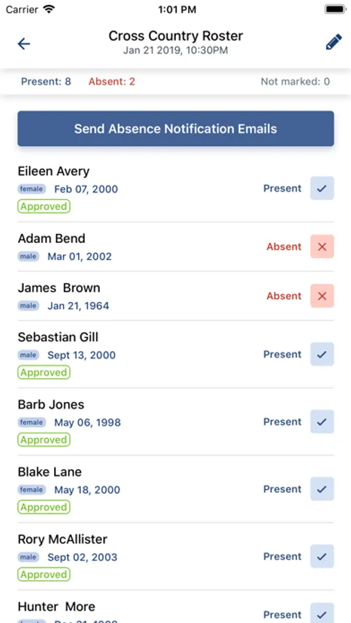 • ‘Absent’, ‘Present’, and ‘Not Marked’ options make it easy for you to track students
