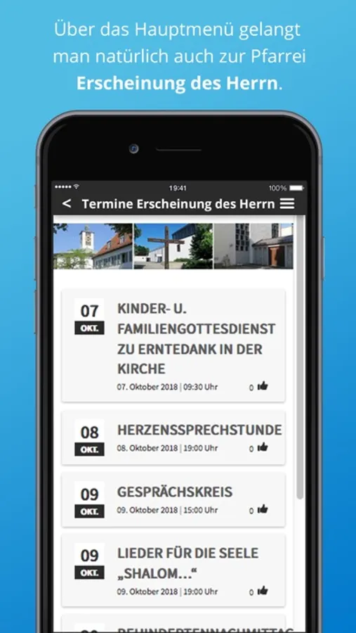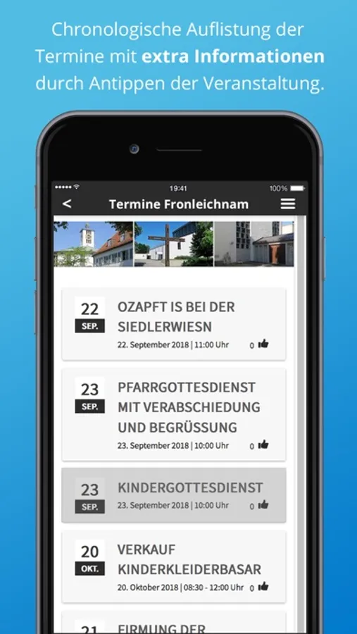 In dieser hat man die Möglichkeit, alle Veranstaltungen, Gottesdienste und regelmäßige Termine chronologisch für ca. die nächsten 6 Wochen anzusehen.