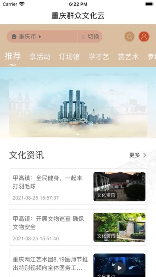 重庆群众文化云是一款聚焦文化领域,提供公众文化生活服务的交互互联网平台,现汇集重庆全部的文体活动、场馆资源、文体社团。平台中集活动预约、空间展示等功能为一体,为用户提供便捷的文化品质生活服务。