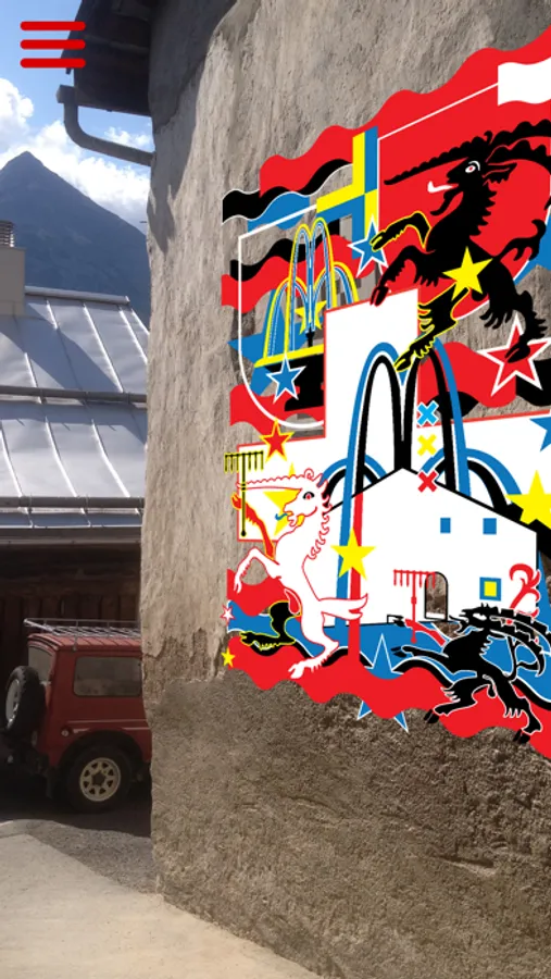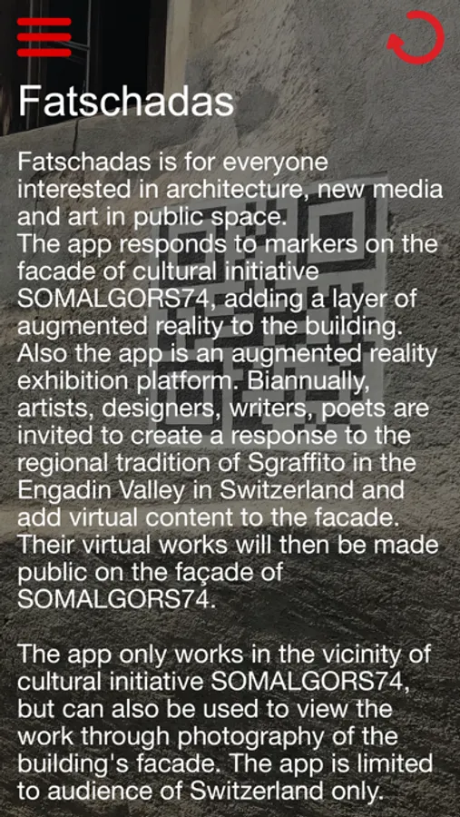 The app only works in the vicinity of cultural initiative SOMALGORS74, but can also be used to view the work through photography of the building's facade. The app is limited to audience of Switzerland only.