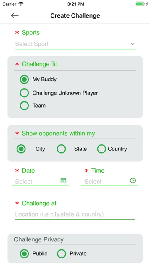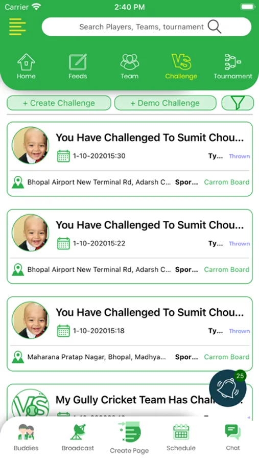 • Throw a Challenge of your favourite sports to your buddy, fix the date & time and Bang On! Meet them in the field.