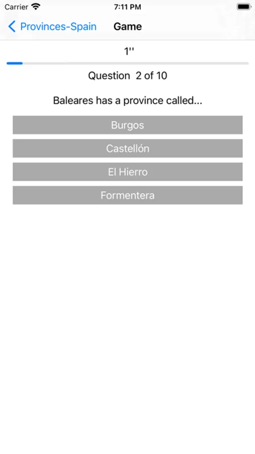 Con Provincias-España podrás aprender las provincias de España fácilmente. La app genera 10 preguntas aleatoriamente de su bbdd y te da cuatro opciones pero solo hay una correcta.