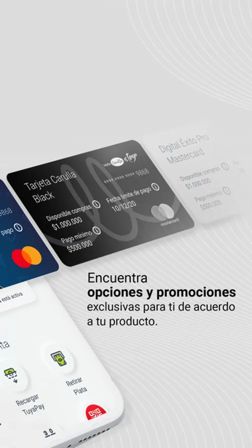 Estamos construyendo contigo una mejor versión de nuestra aplicación. ¡Disfruta tus tarjetas de crédito Éxito, Alkosto, Carulla, Surtimayorista, Claro y Viva desde cualquier parte! Haz tus consultas de cupo, saldo, pagos, movimientos, extractos y nuestra sección de promociones exclusivas.