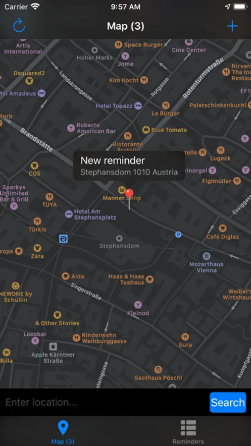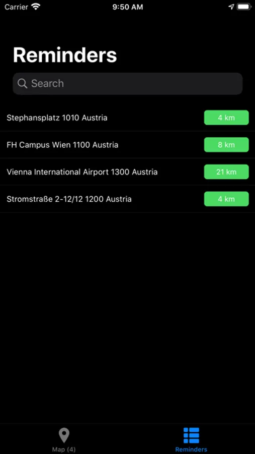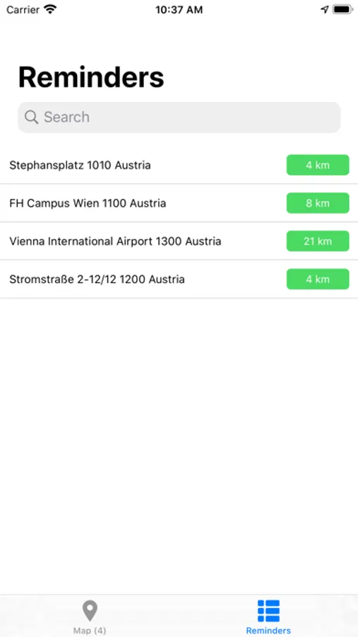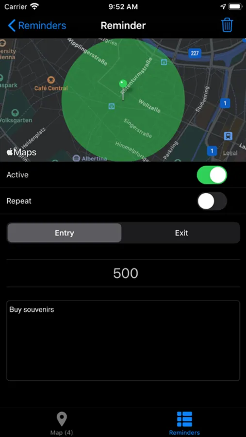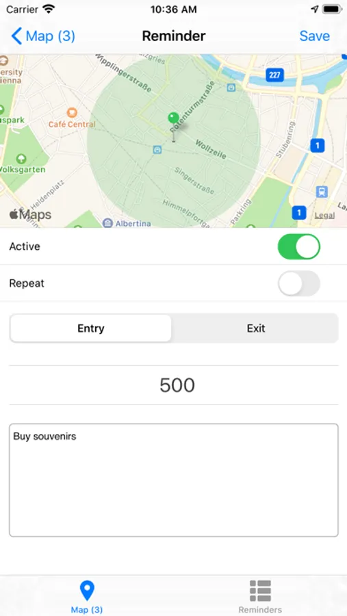 MapReminders lets you create reminders for a given area on a map. All reminders created with MapReminder are saved only on your device. The app uses the location data provided by iOS and as little battery energy as possible.