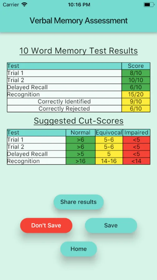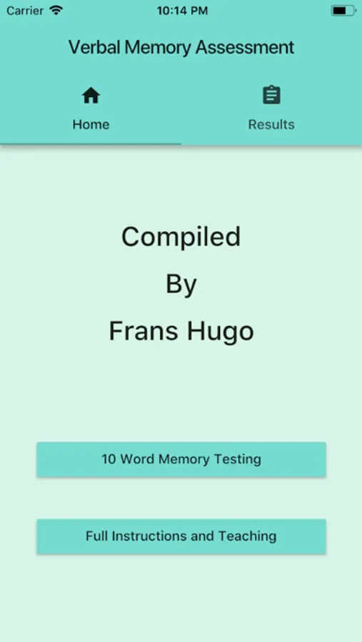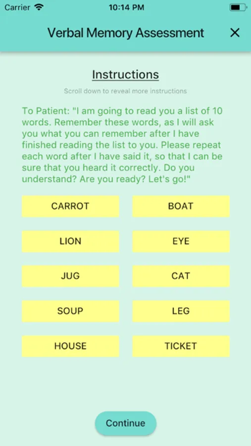 The Verbal Memory Assessment App does not provide medical advice and cannot replace good clinical practice. It is intended for health professionals familiar with this type of assessment. Use of the App is at your own risk. Clinicians are strongly encouraged to first read the Full Instructions and Teaching Booklet that accompanies the App.