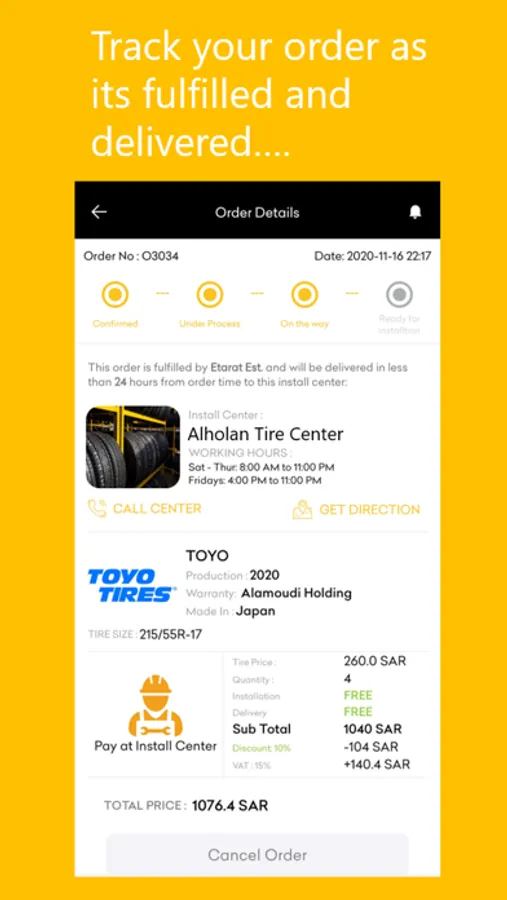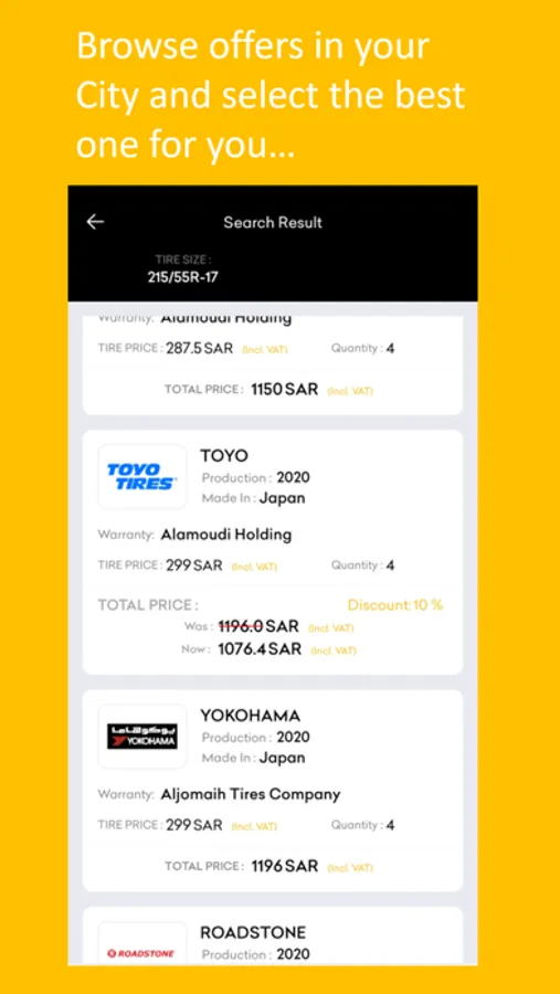 تطبيق إستبنة يساعدك في الحصول على أفضل إطار لسيارتك بأفضل الأسعار. قم بالبحث من خلال مقاس الإطار وسيقوم إستبنة بعرض أفضل الإطارات لدى موردي الجملة في مدينتك. إختر الإطار المناسب ليتم توصيله لمركز تركيب قريب منك ومن ثم توجه للمركز لتركيب إطاراتك الجديدة.