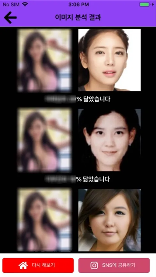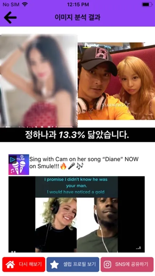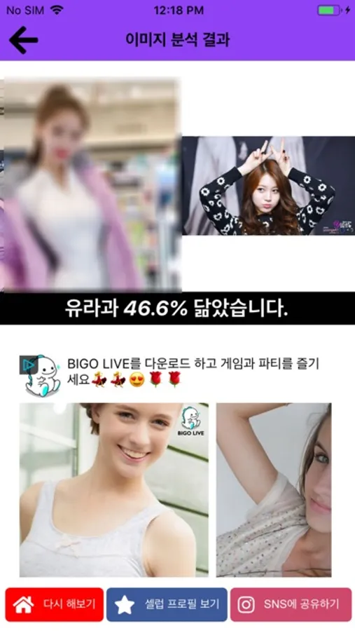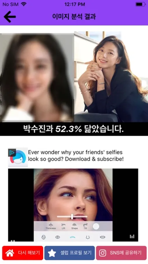 4.Sns에 공유한다 / 닮은 연예인 프로필을 찾아본다 /다시 한번 찾아본다.